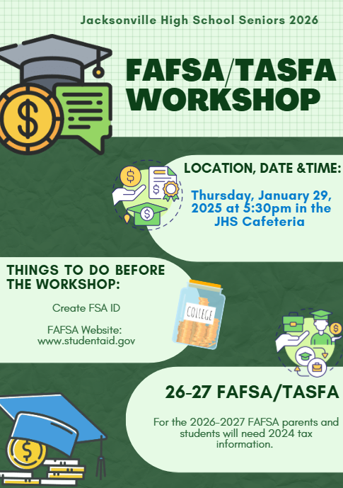 Seniors, our next FAFSA workshop will be on Thursday, January 29, 2026, at 5:30pm in the JHS cafeteria. This will be our last FAFSA workshop, so please plan to attend if you still need help complet...
