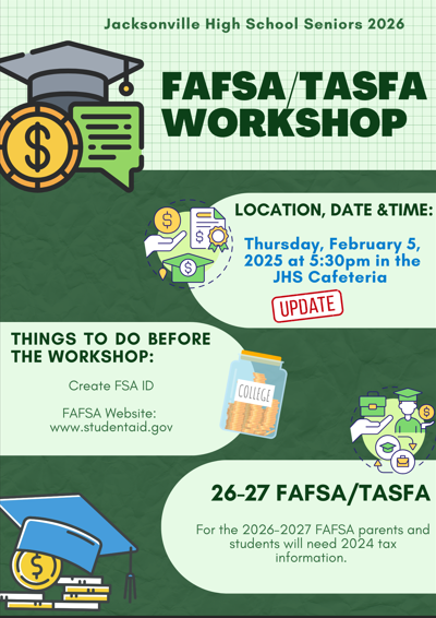 Seniors, the January 29, 2026 FAFSA date has been moved to Thursday, February 5, 2026 at 5:30pm.Please see the updated flyer below. Thanks,Mrs. Stephens