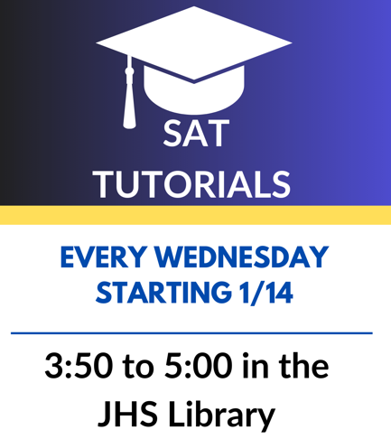We will host SAT prep tutorials every Wednesday afternoon starting tomorrow (1/14) in the JHS library. Tutorials will start at 3:50 and end at 5:00. All 11th graders are welcome to join!